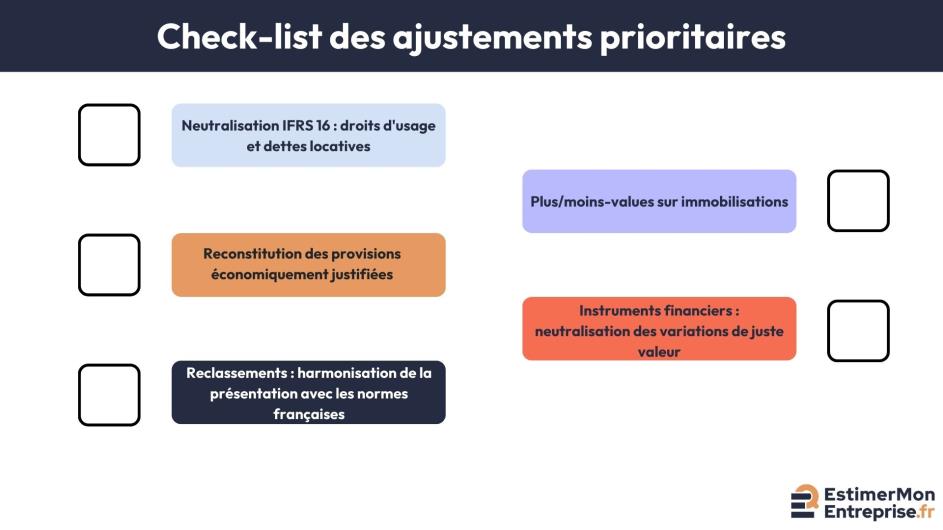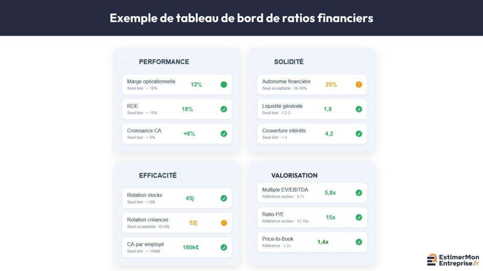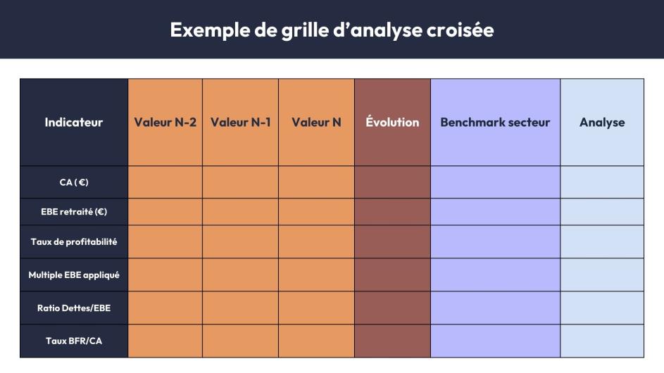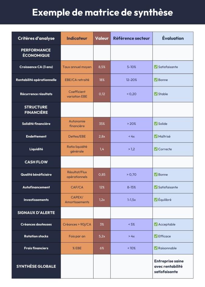 Normalisez les données comptables en éliminant les éléments exceptionnels, en retraitant la rémunération dirigeante et en ajustant les provisions. Calculez les agrégats économiques (EBE, résultat d'exploitation retraité, capacité d'autofinancement).